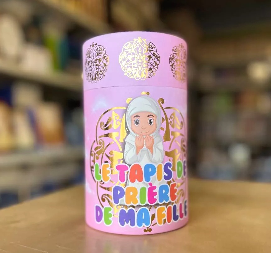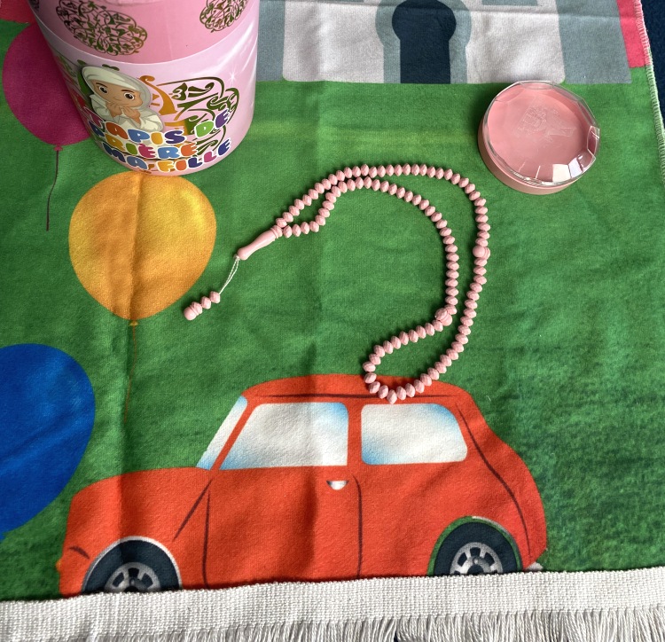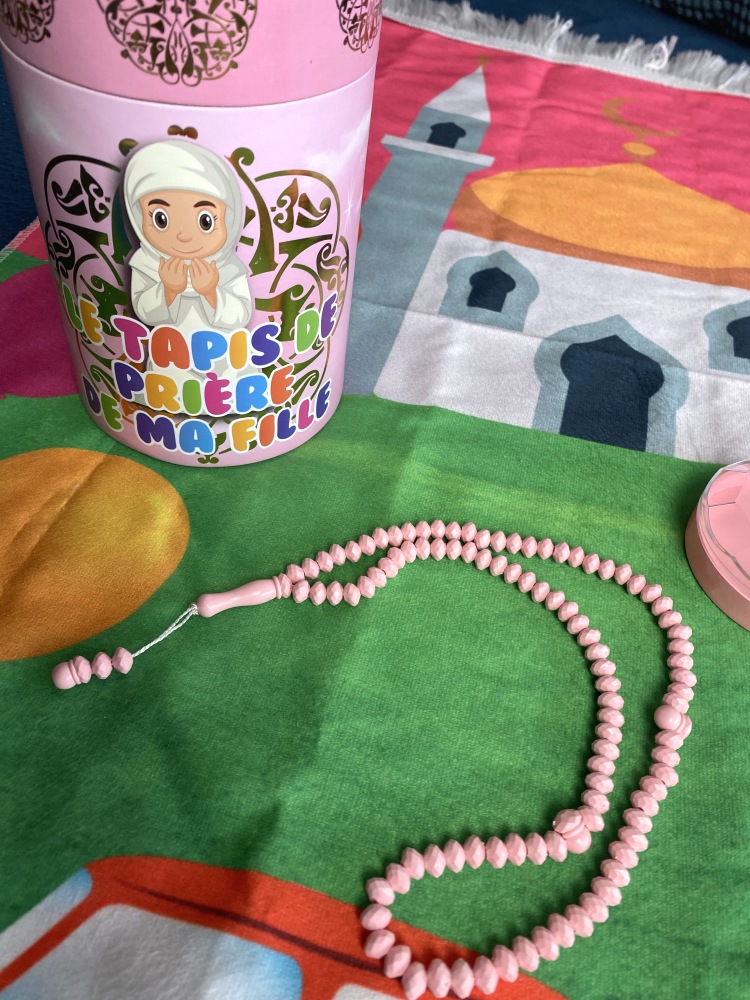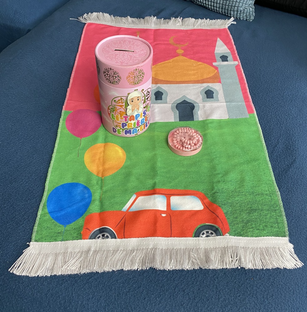 Coffret tirelire avec tapis et et chapelet parfumé (tasbih) pour fillettes musulmanes (couleur rose). version garçon.