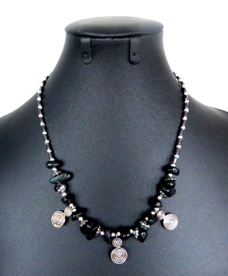 Collier artisanal marocain avec pierres noir, agrémenté de petites breloques tourbillon en métal argenté Vetement & Accessoire