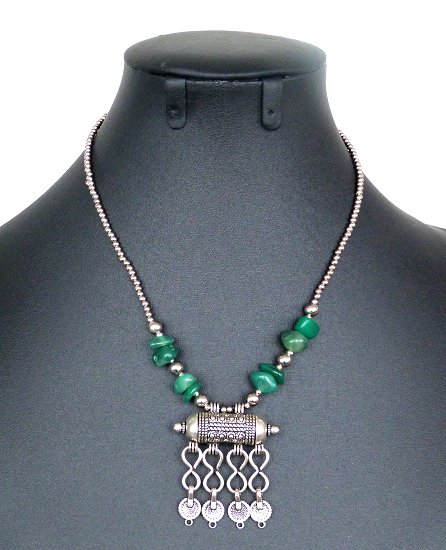 Collier artisanal marocain avec pierres verte agremente de breloques gravees argentees