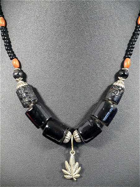 Collier ethnique artisanal 6 pierres cylindriques noires 15x14mm agrémentées d'une breloque en forme de palmier - REF. 28573 (25.00 €)