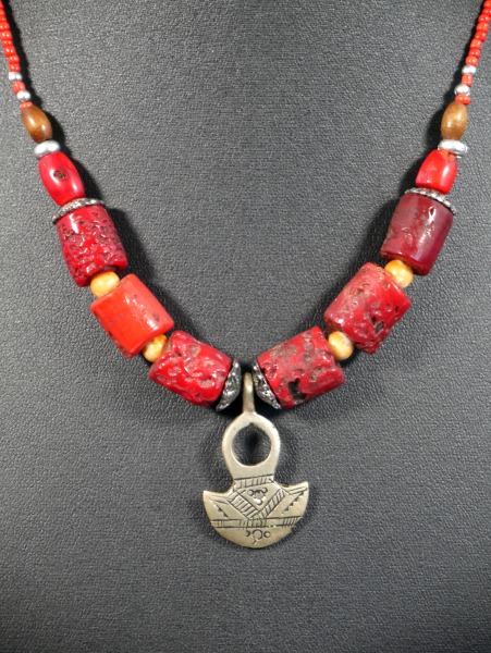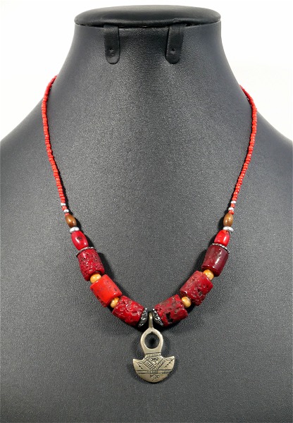 Collier ethnique artisanal 6 pierres cylindriques rouges 12x14mm agrémentées d'une breloque en forme de buste - REF. 28574 (25.00 €)