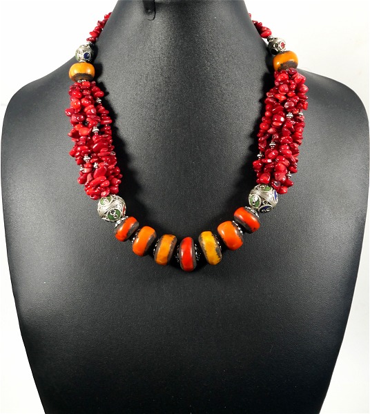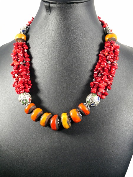 Collier ethnique artisanal imitation pierres de corail séparées de perles en métal et composé de perles rouges - REF. 18945 (14.00 €)