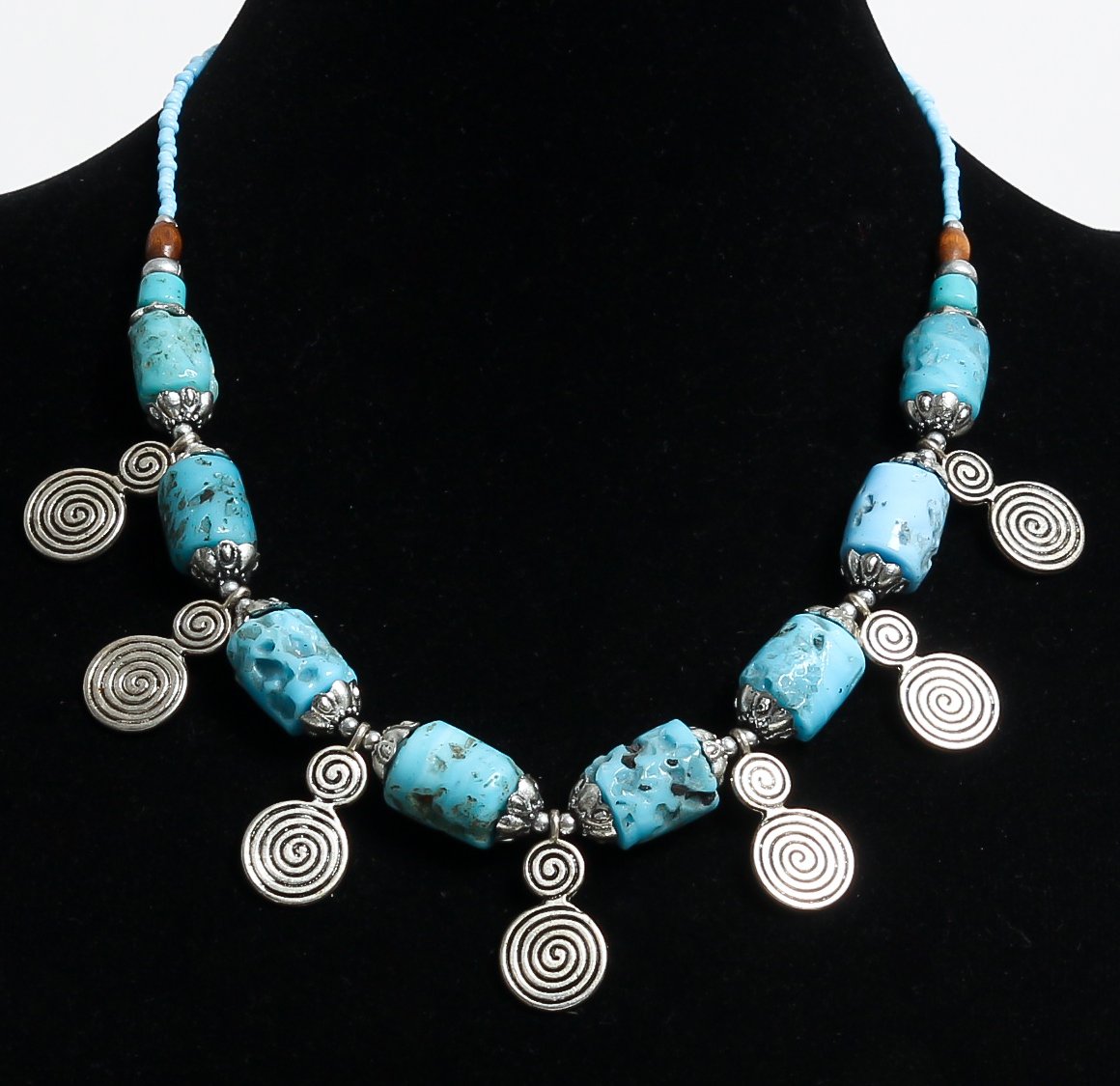 Collier ethnique artisanal cylindres imitation corail turquoise avec armatures en métal argenté ciselé agrémenté de pendentifs tourbillon spirale argentés Vetement & Accessoire