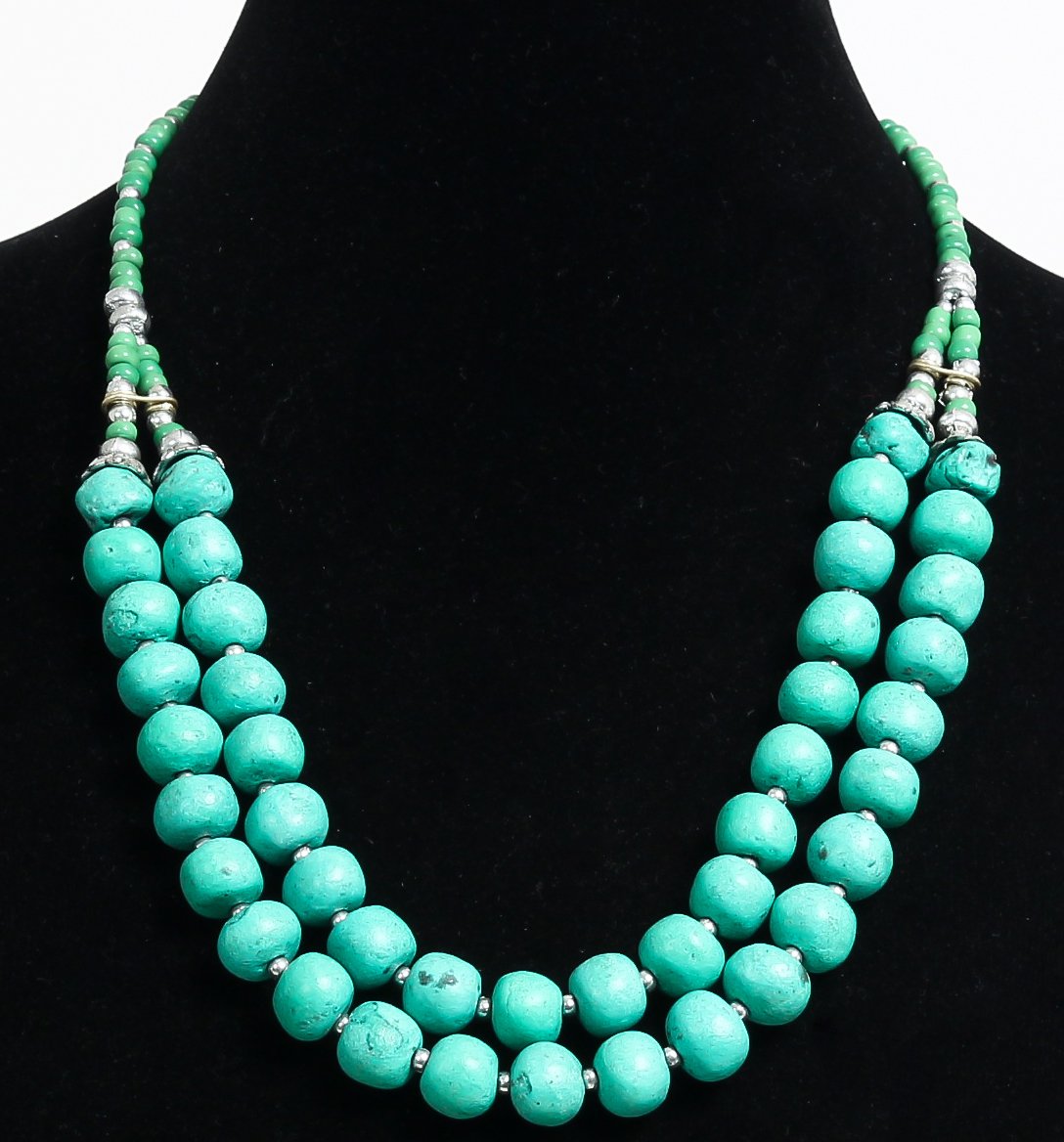Collier ethnique artisanal deux rangs imitation pierres rondes turquoises agencees de perles vertes et argentees