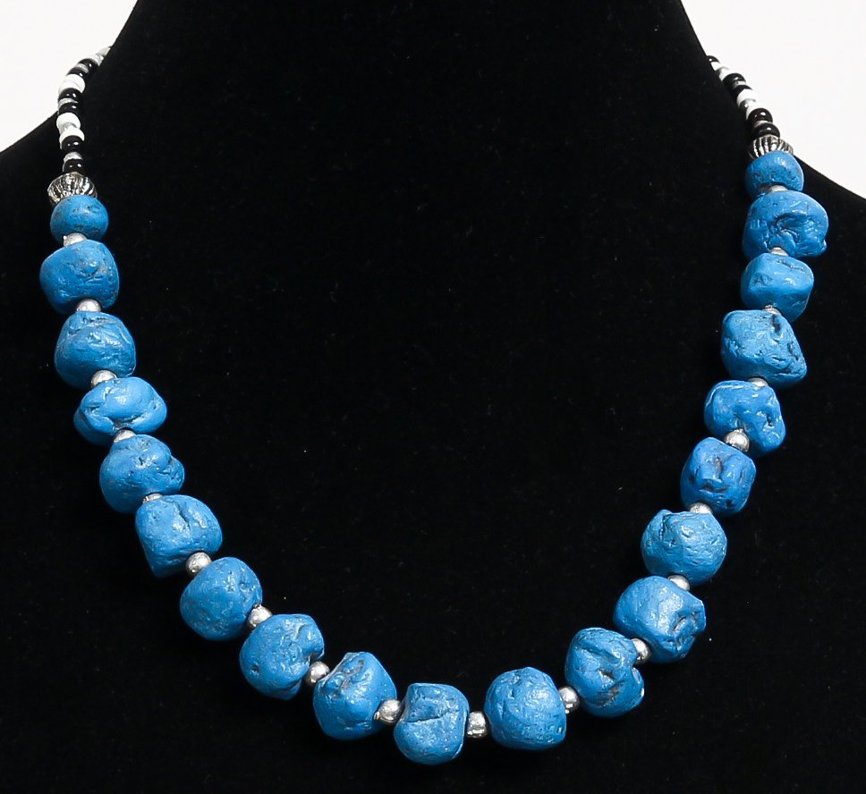 Collier ethnique artisanal imitation boules turquoises difformes séparées de perles en métal et composé d'autres perles noires et blanches - REF. 18942 (14.00 €)