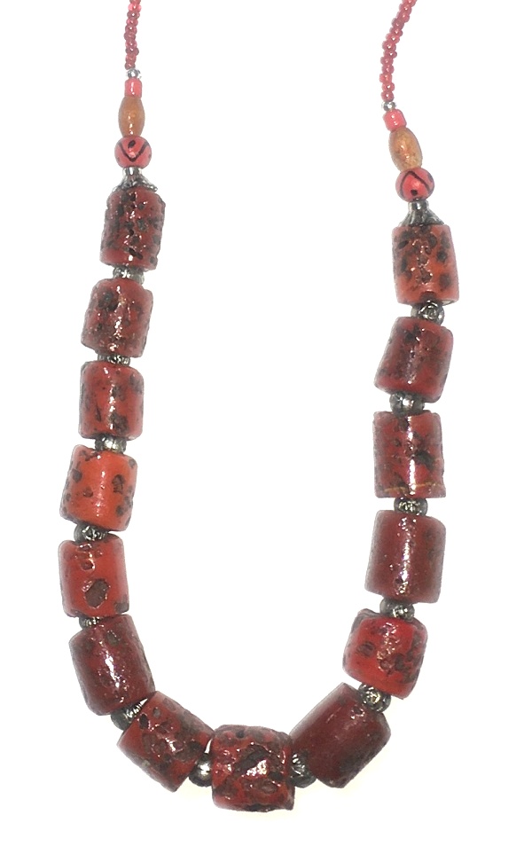Collier ethnique artisanal imitation pierres de corail séparées de perles en métal et composé de perles rouges - REF. 18945 (14.00 €)