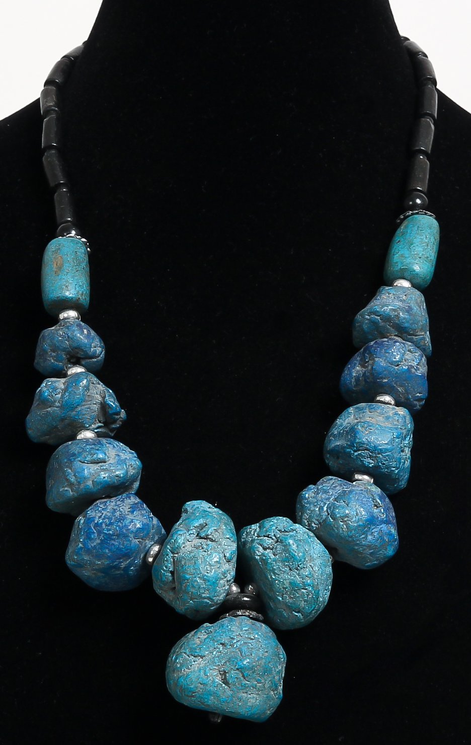 Collier ethnique artisanal imitation petites pierres bleues agrémentées de perles noires et en métal - REF. 18968 (18.00 €)