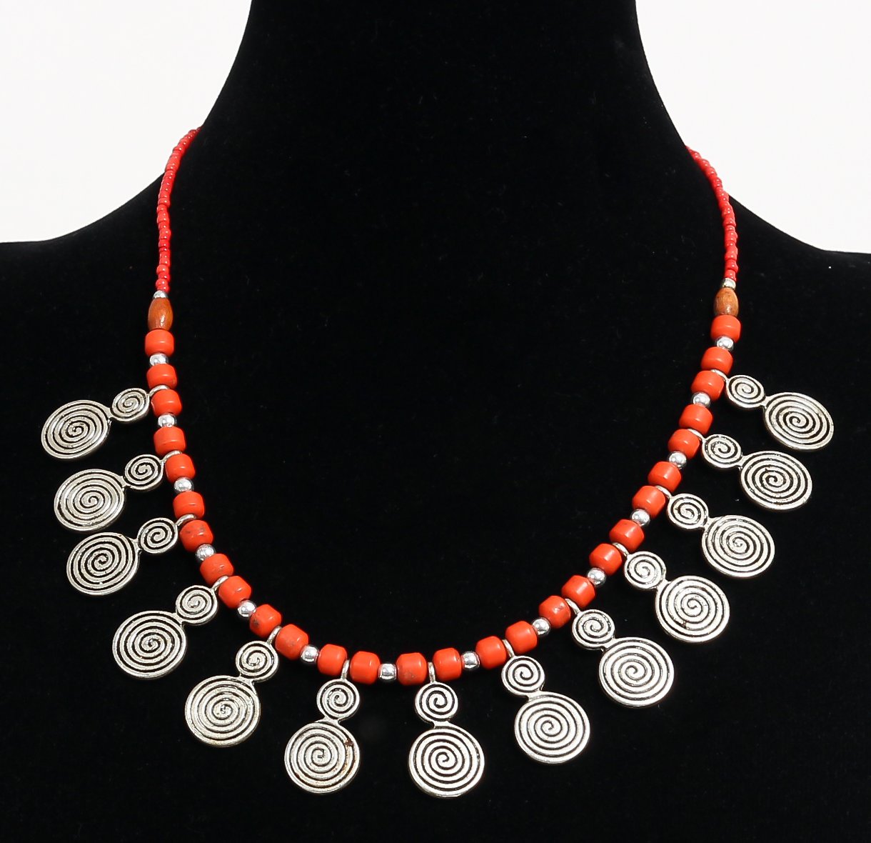 Collier ethnique artisanal imitation perles corail rouge agencées de perles argentées et de petites breloques tourbillon en métal Vetement & Accessoire