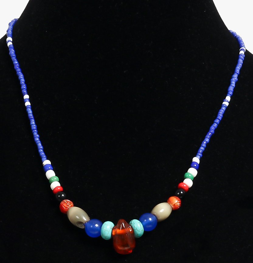 Collier ethnique artisanal imitation corail bleu et noir agrémenté de perles bleues et noires - REF. 18983 (16.00 €)
