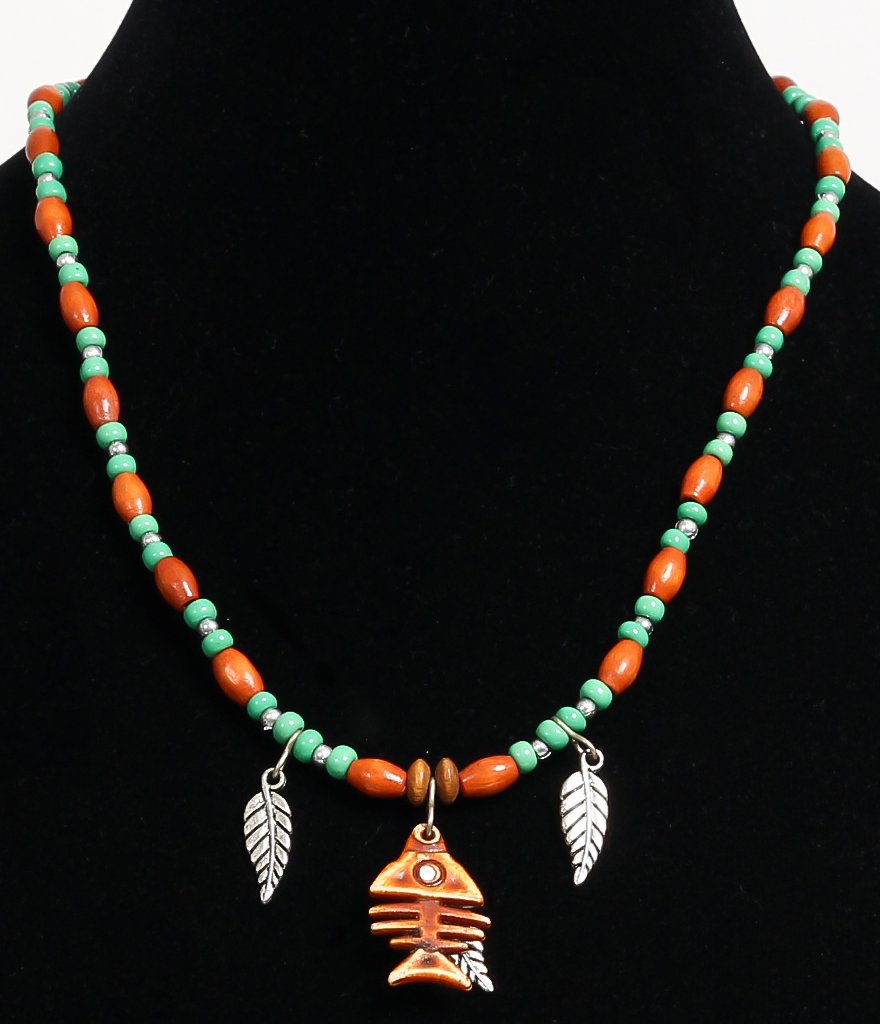 Collier ethnique artisanal imitation pierres corail, agrémenté de perles noires et en bois - REF. 18906 (14.00 €)