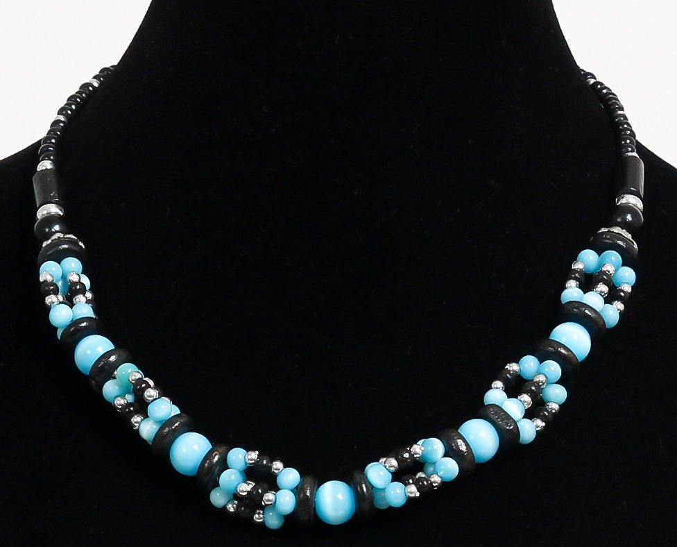Collier ethnique artisanal imitation pierres bleues agrémentées de perles en métal, noires et et blanches - REF. 18946 (14.00 €)
