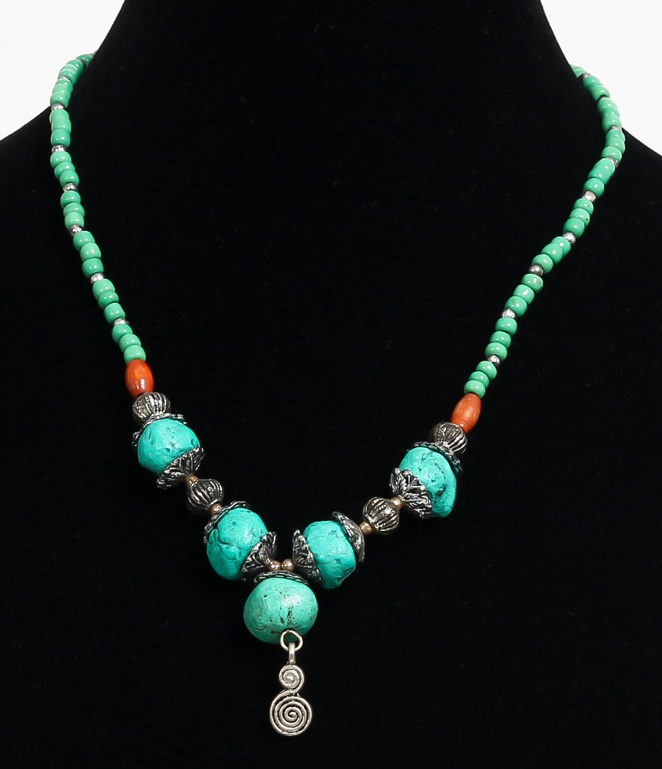 Collier ethnique artisanal imitation perles vertes, des pierres turquoises agremente d'un pendentif tourbillon