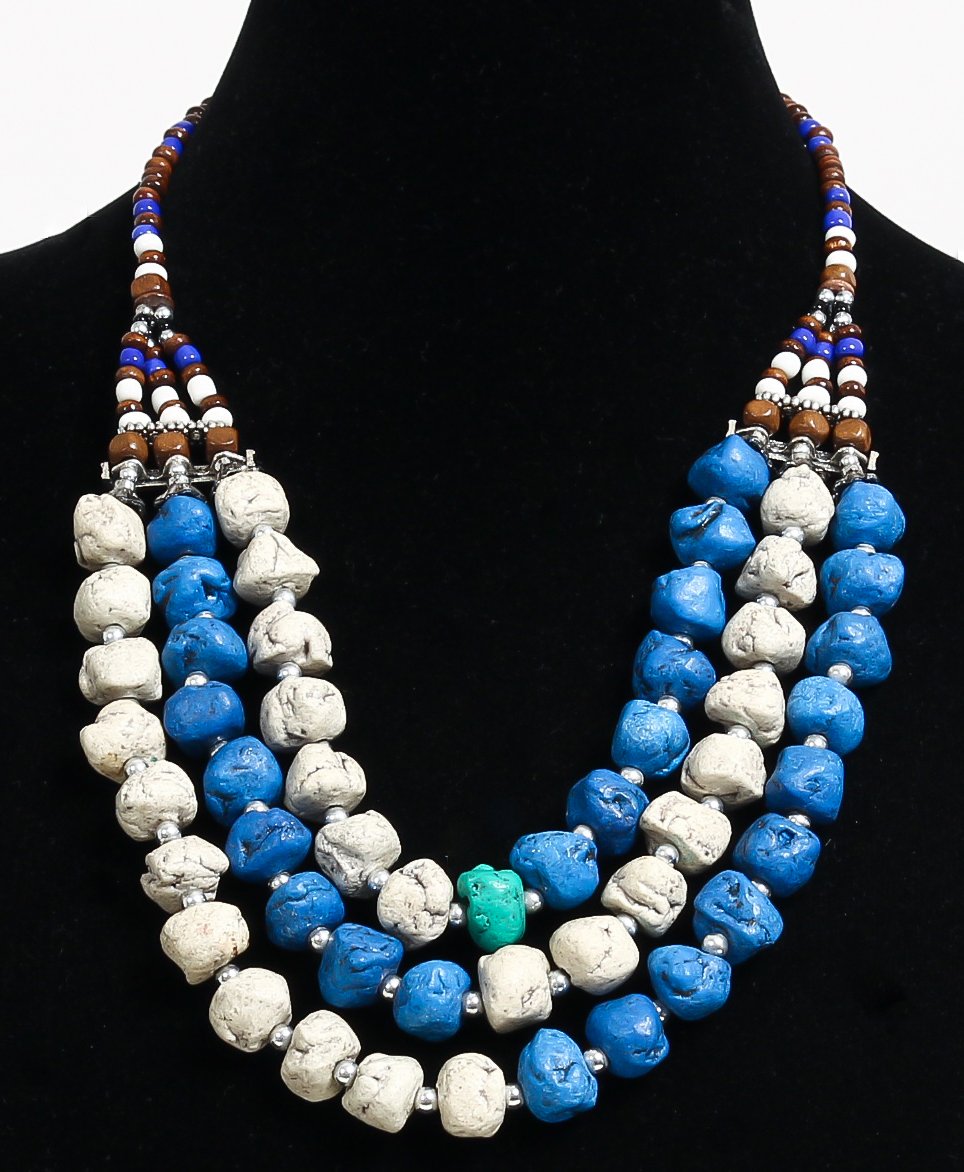 Collier ethnique artisanal imitation pierres blanches, bleues, turquoises trois rangs perles agencées de pièces argentées ciselées Vetement & Accessoire