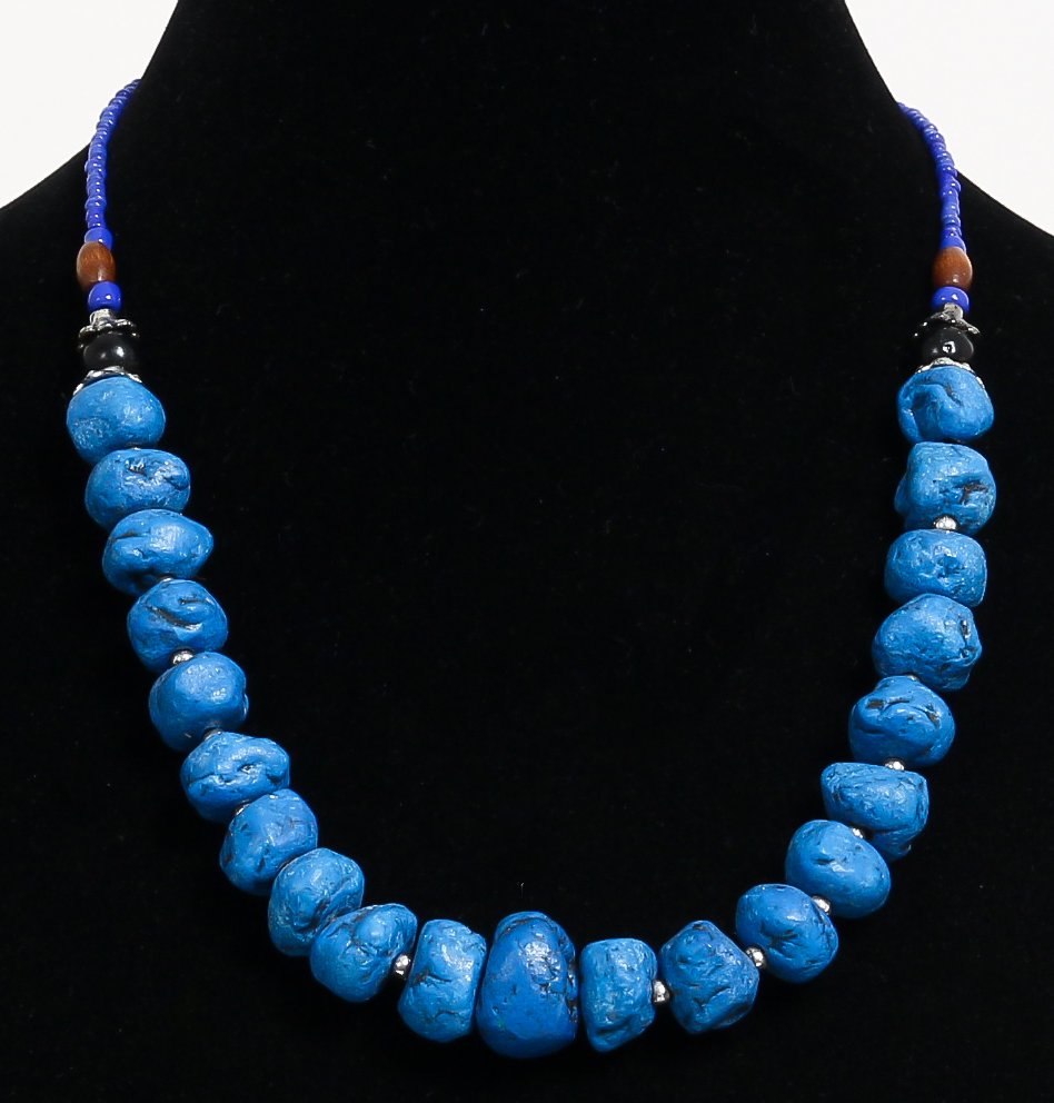 Collier ethnique artisanal imitation boules turquoises difformes séparées de perles bleues - REF. 18938 (14.00 €)