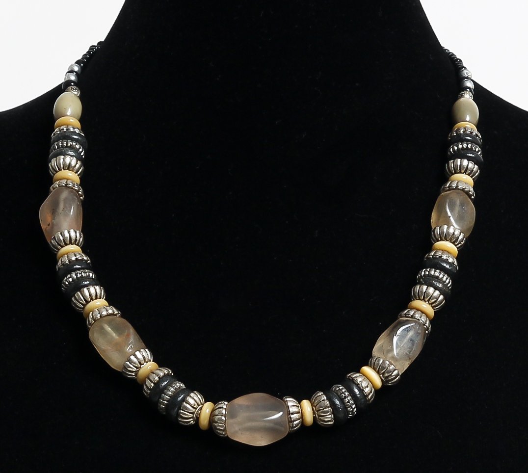 Collier ethnique artisanal imitation boules blanches agrémentées de quartz transparent et marron - REF. 19125 (22.00 €)