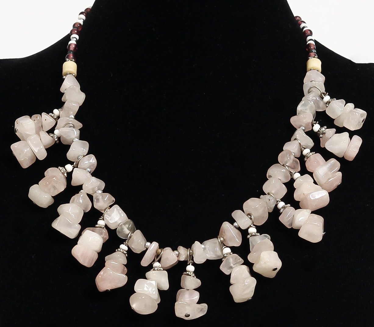 Collier ethnique artisanal imitation pierres marbrees agencement quartz et agremente de pieces metallique