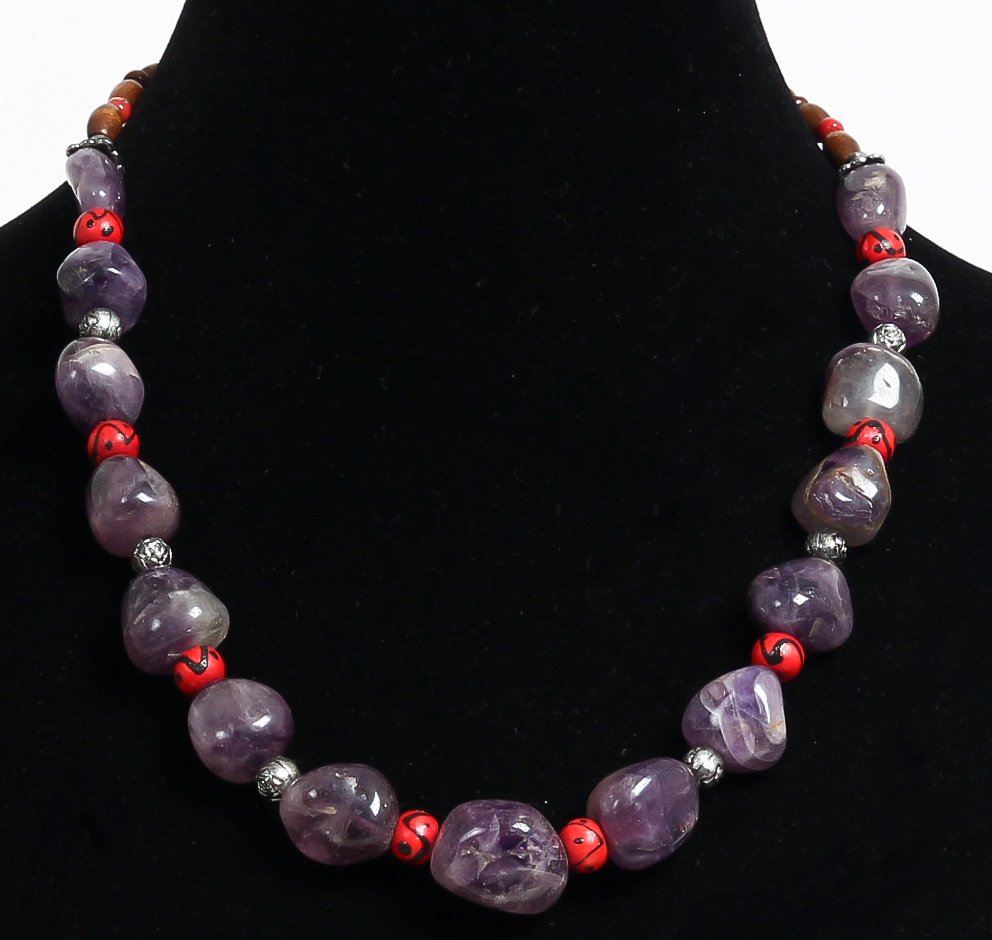 Collier ethnique artisanal imitation pierres marbrées mauves agrémentées de perles argentées, rouges et en bois - REF. 19090 (15.00 €)