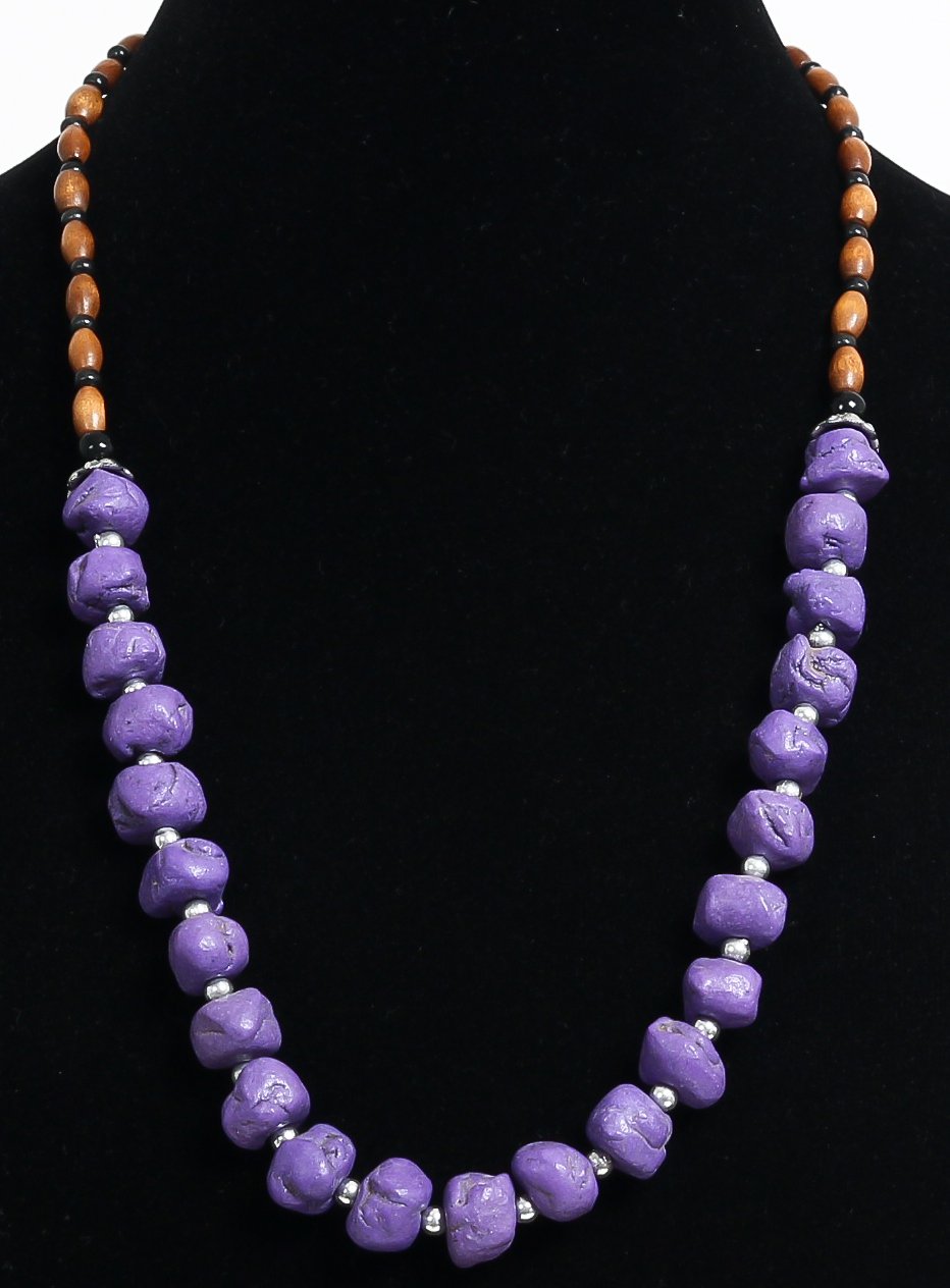 Collier ethnique artisanal imitation pierres mauves agrémentées de perles noires, argentées et d'autres en bois - REF. 17230 (14.00 €)