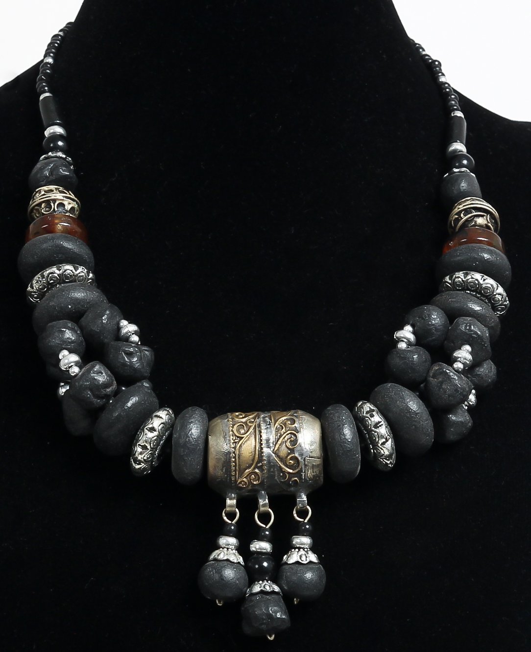 Collier ethnique artisanal imitation pierres noires difformes agrementees de perles noires et de breloques gravees argentees