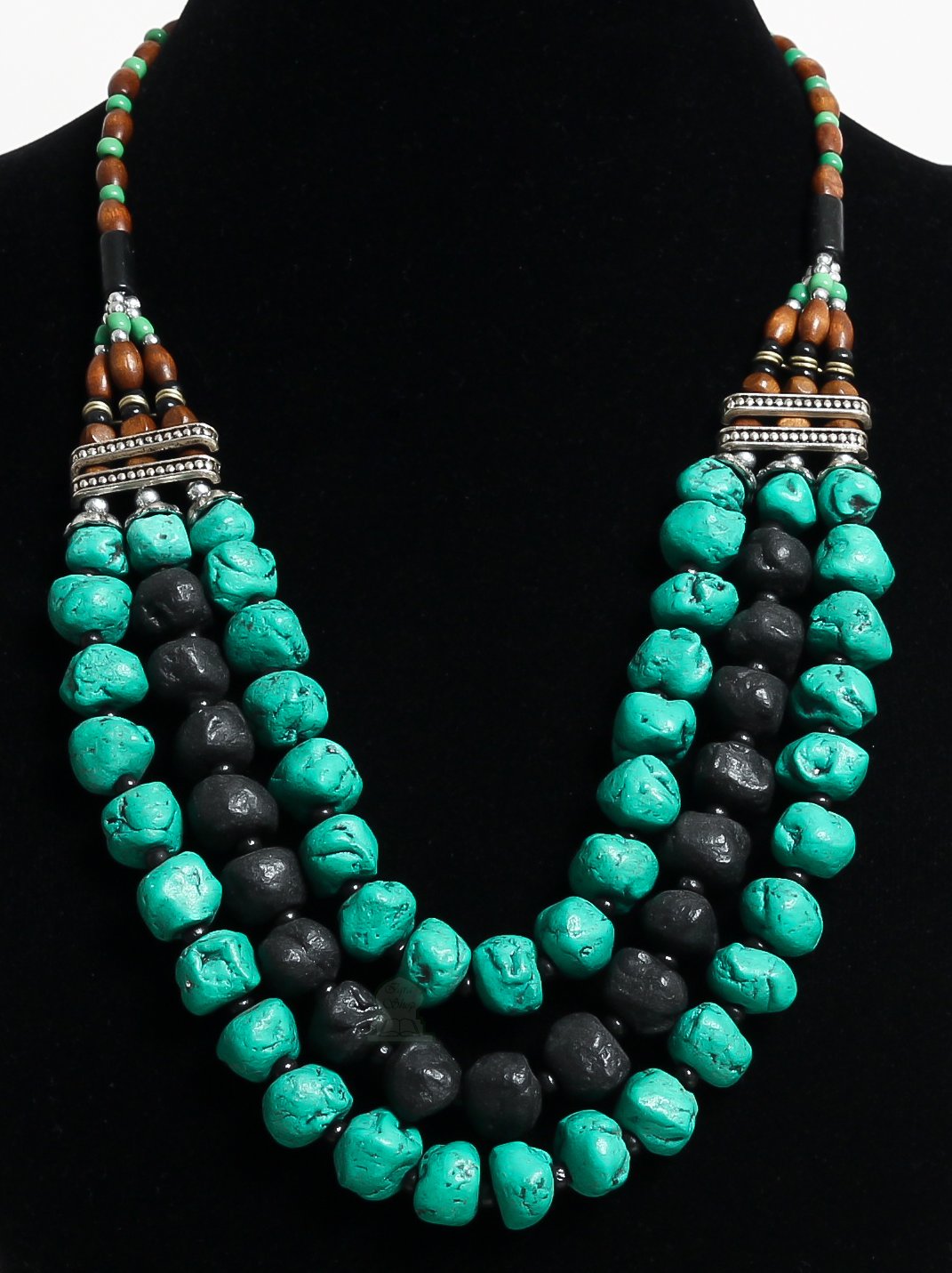 Le collier est composé de deux rangés de pierres turquoises (externes) et une rangée de pierres noires (au milieu), lesquelles sont liées à leurs deux extrémités par des pièces argentées ciselées à des perles turquoises et autres en bois de façon alterne...