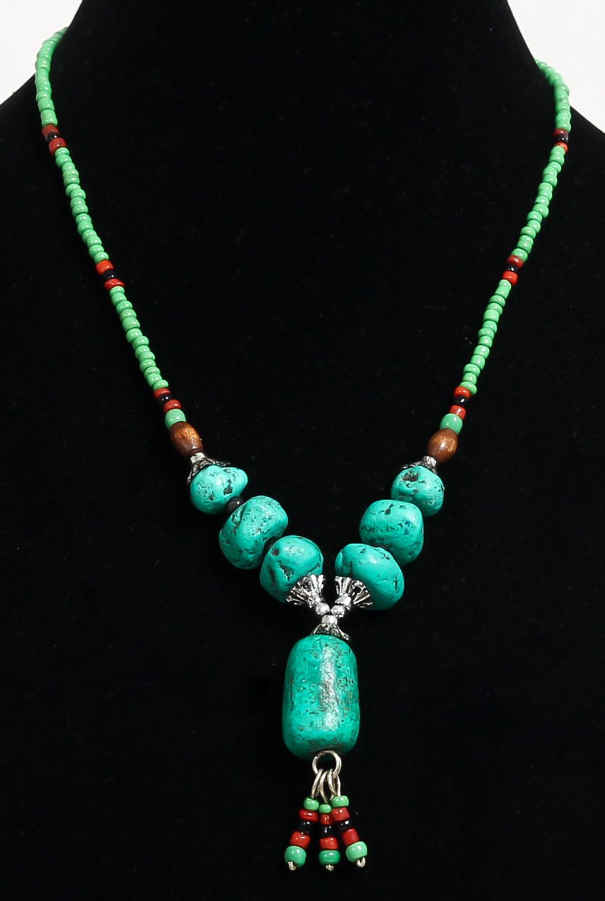 Collier ethnique artisanal imitation perles vertes, des pierres turquoises agrémenté d'un pendentif tourbillon - REF. 18904 (22.00 €)