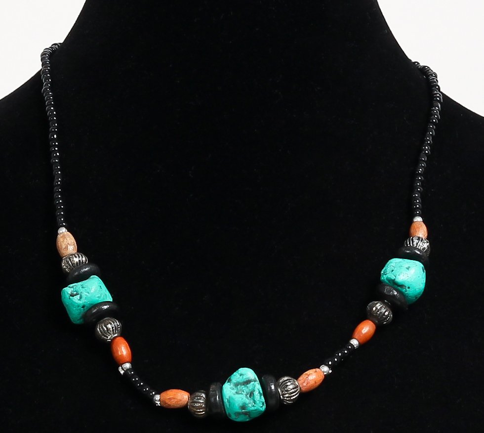 Collier ethnique artisanal imitation boules difformes turquoises séparées de perles noires, composé d'autres perles vertes et en bois avec une boule en métal au milieu - REF. 18940 (14.00 €)