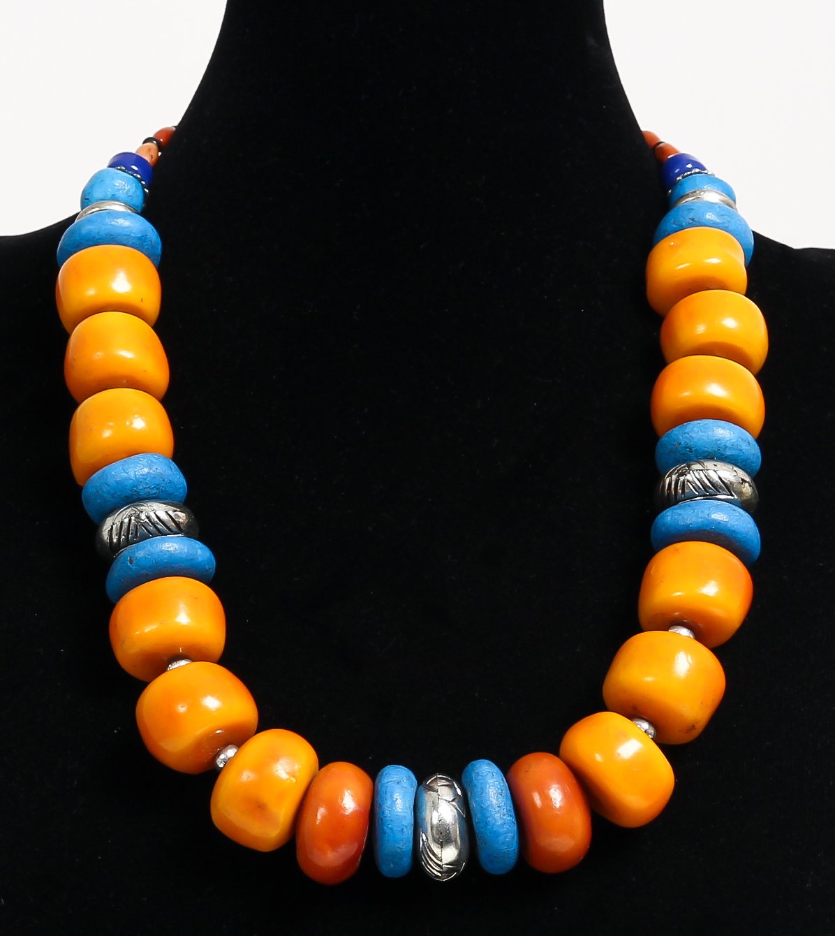 Collier ethnique artisanal avec pierres orange et turquoise agrémenté de breloques et d'armatures argentées - REF. 29713 (30.00 €)