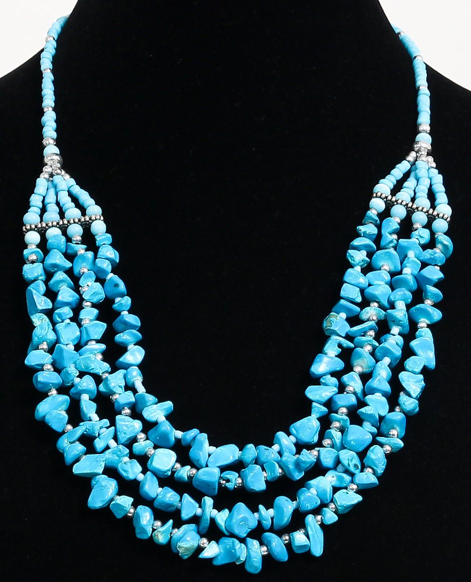 Collier ethnique artisanal quatre rangs imitation pierres turquoises agrémenté d'armatures argentées ciselées et de perles Vetement & Accessoire