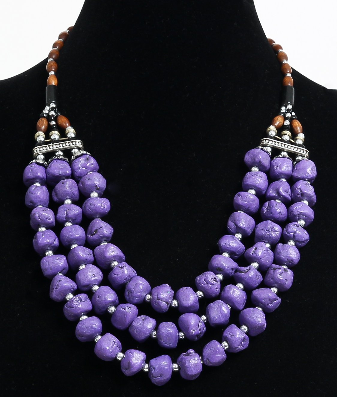 Collier ethnique artisanal trois rangs imitation pierres mauves et perles agencées de pièces argentées ciselées Vetement & Accessoire