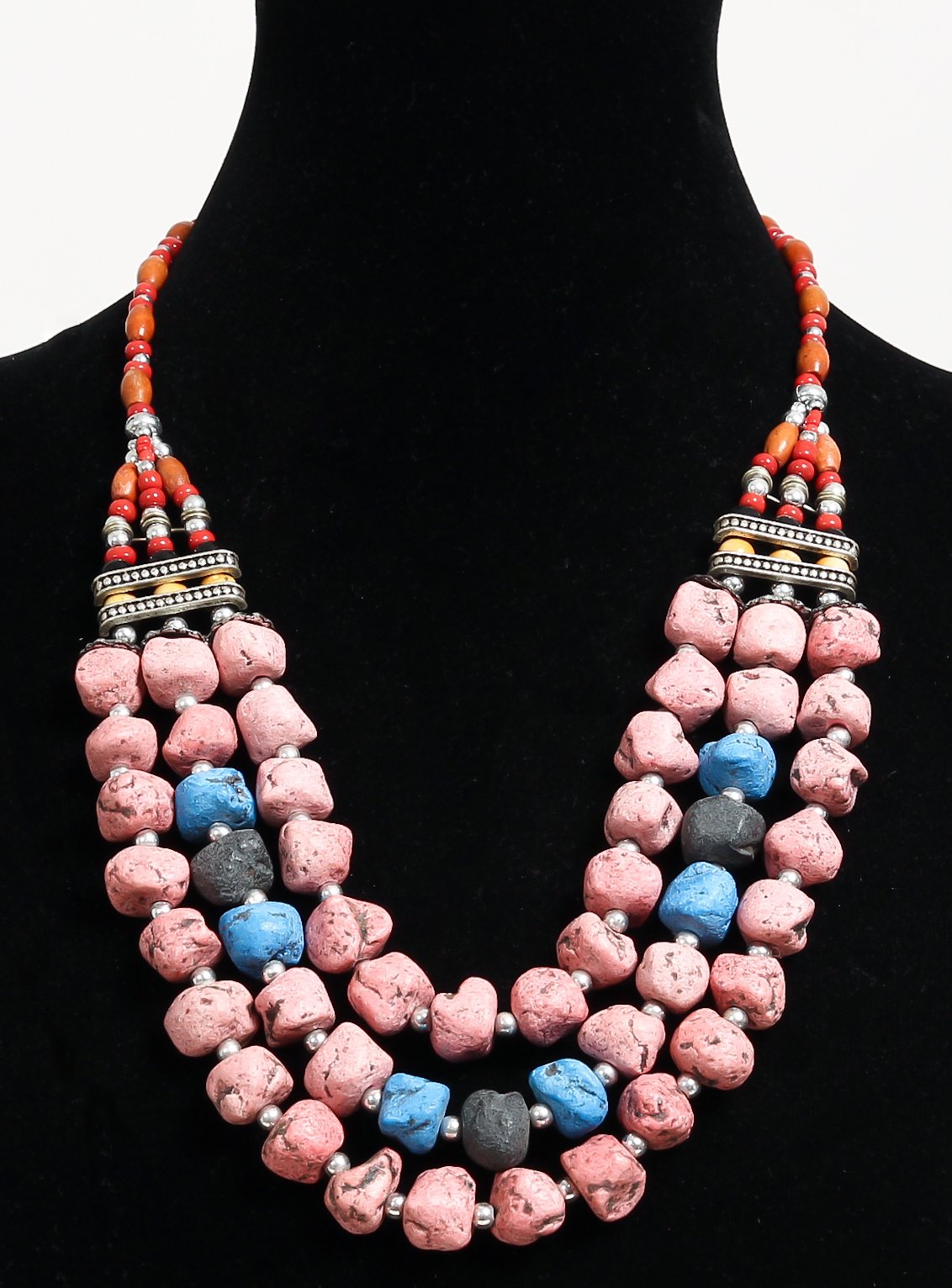 Collier ethnique artisanal trois rangs imitation pierres roses, noires, bleues, agrémentées de perles et d'armatures argentées Vetement & Accessoire