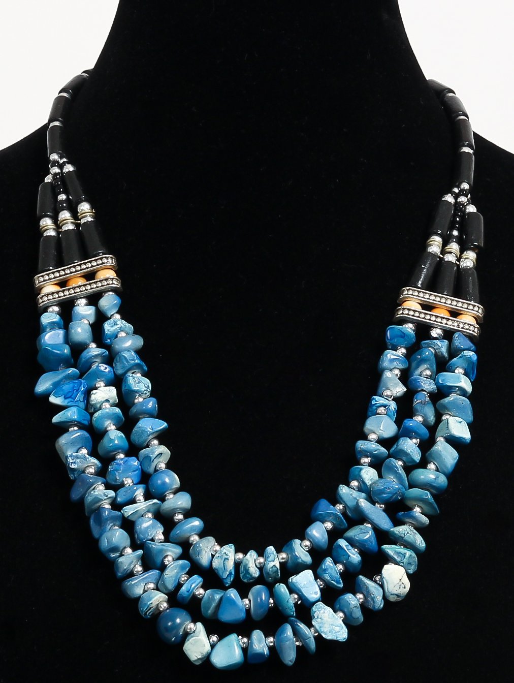 Collier ethnique artisanal trois rangs imitation quartz bleu agrémenté de perles en métal et de tubes noirs Vetement & Accessoire
