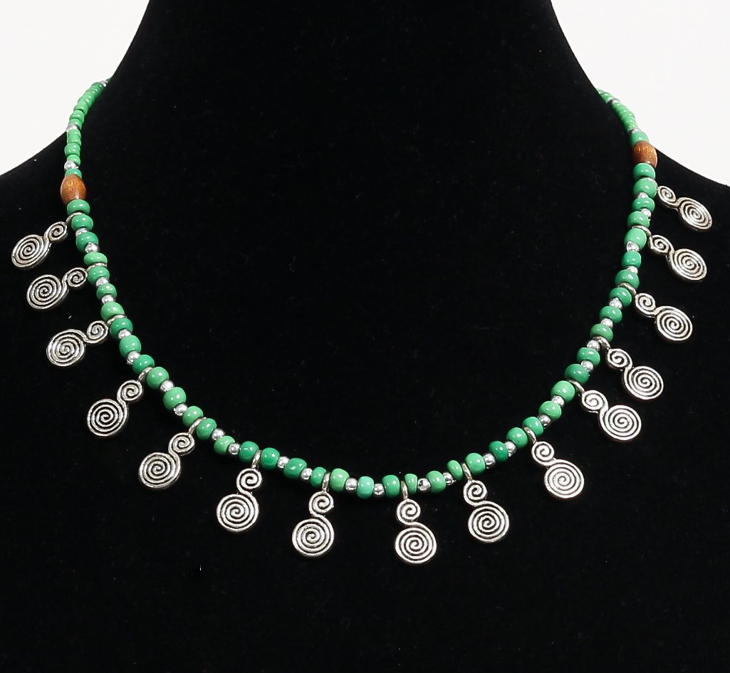 Collier ethnique artisanal imitation perles vertes agrémentées de breloques en spiral en métal argenté - REF. 19062 (18.00 €)