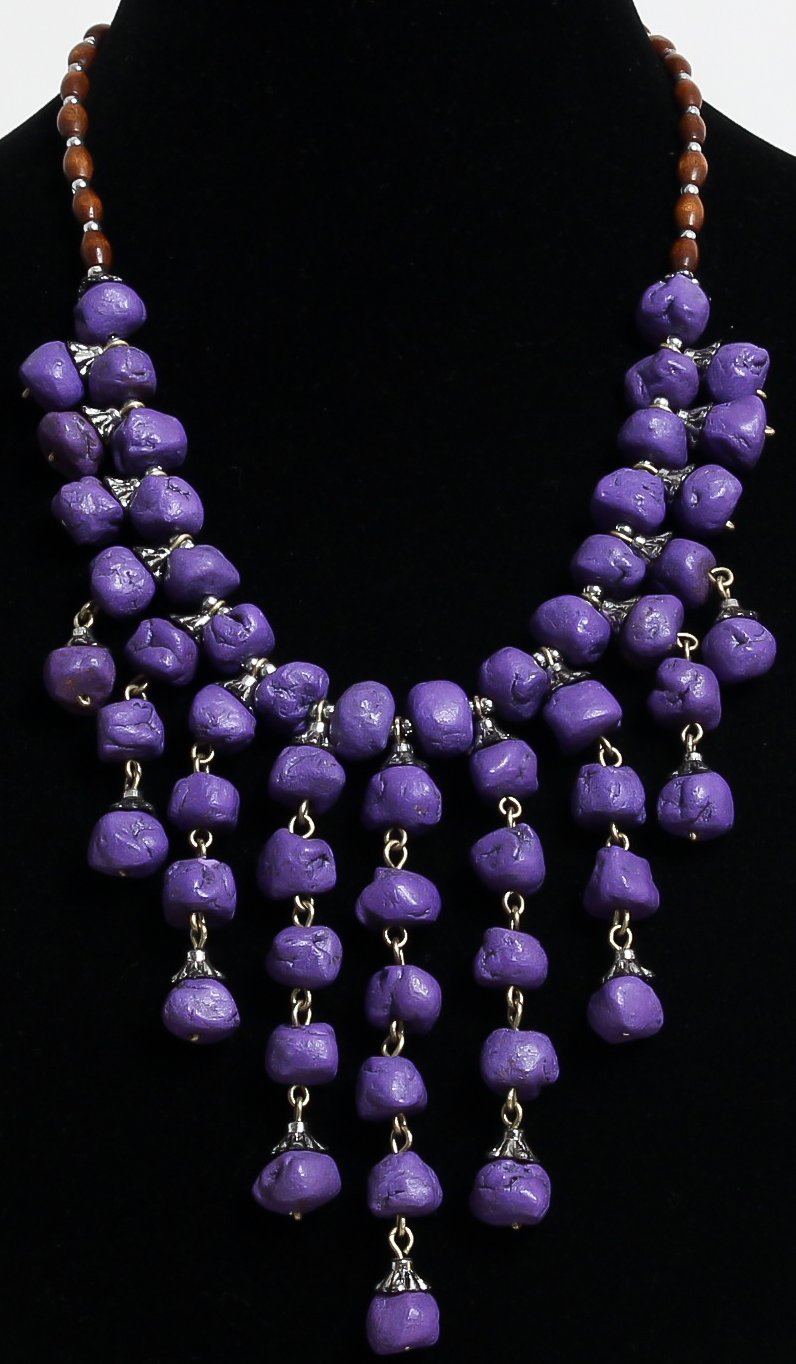 Collier ethnique artisanal imitation boules mauves difformes, séparées de perles en métal avec d'autres en bois, noires, bleues et blanches - REF. 18937 (14.00 €)