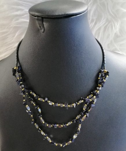 Collier fantaisie femmes pierres noires agencees de petites perles dorees