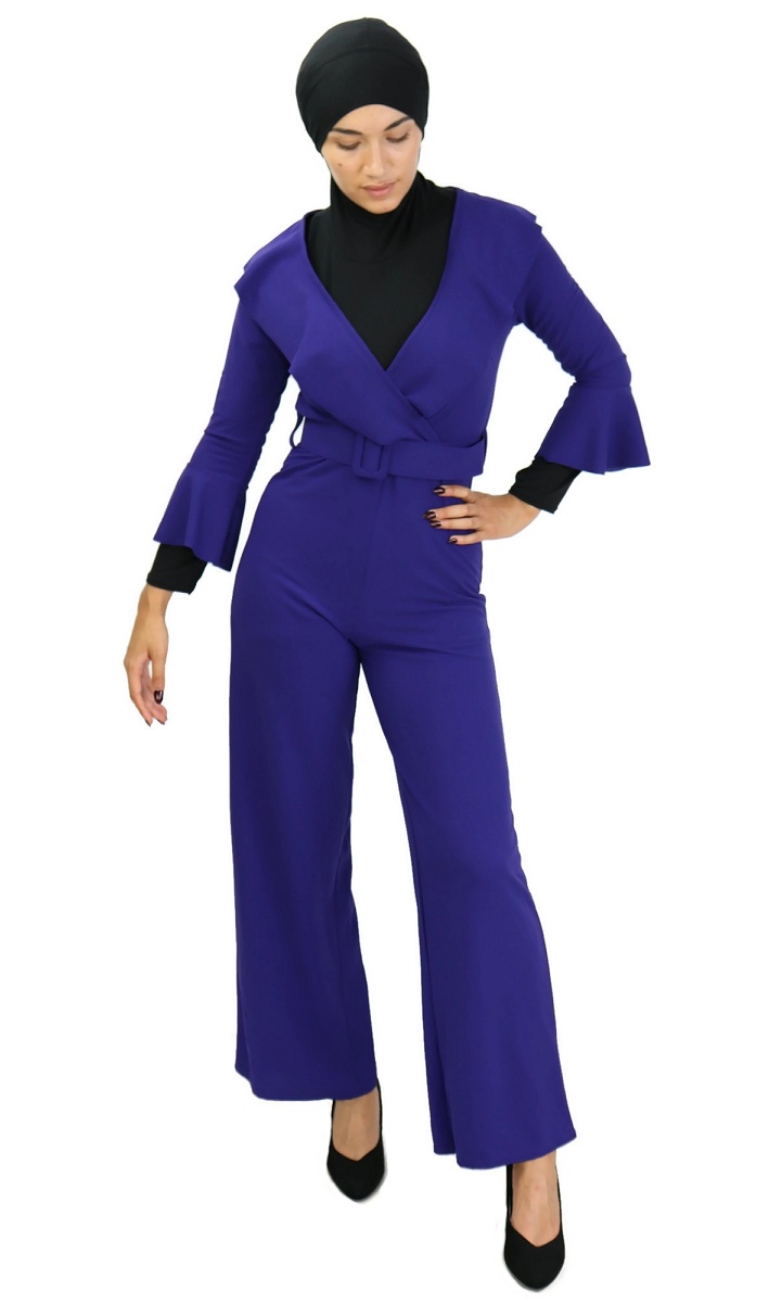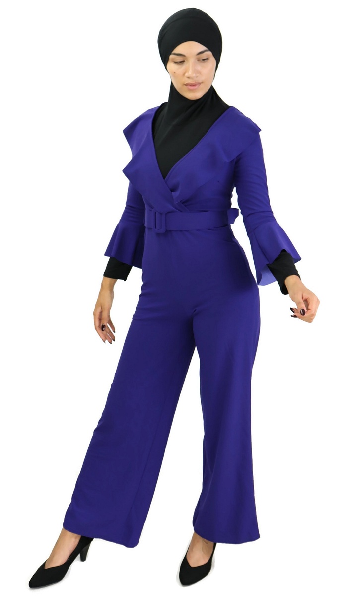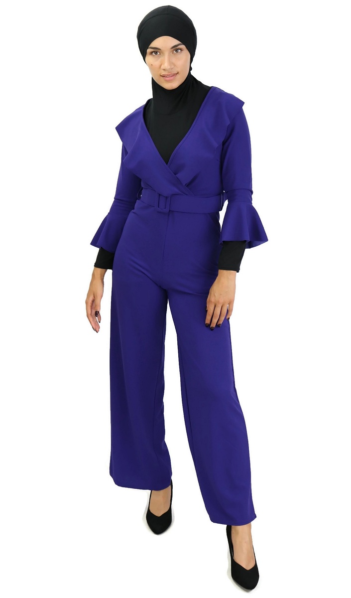 Combinaison pantalon col en V avec effet croisé style cache cœur, manches longues à volant avec Ceinture à la taille