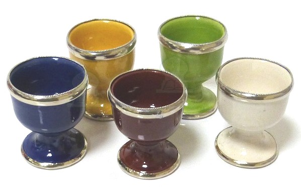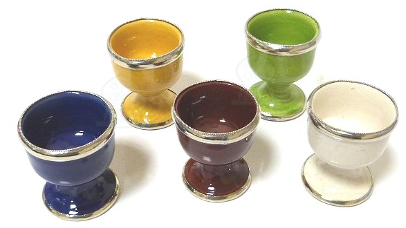 Coquetier artisanal en poterie, en provenance de Marrakech (Maroc), peint en marron, émaillé, et cerclé de métal ornemental argenté, légèrement ciselé.