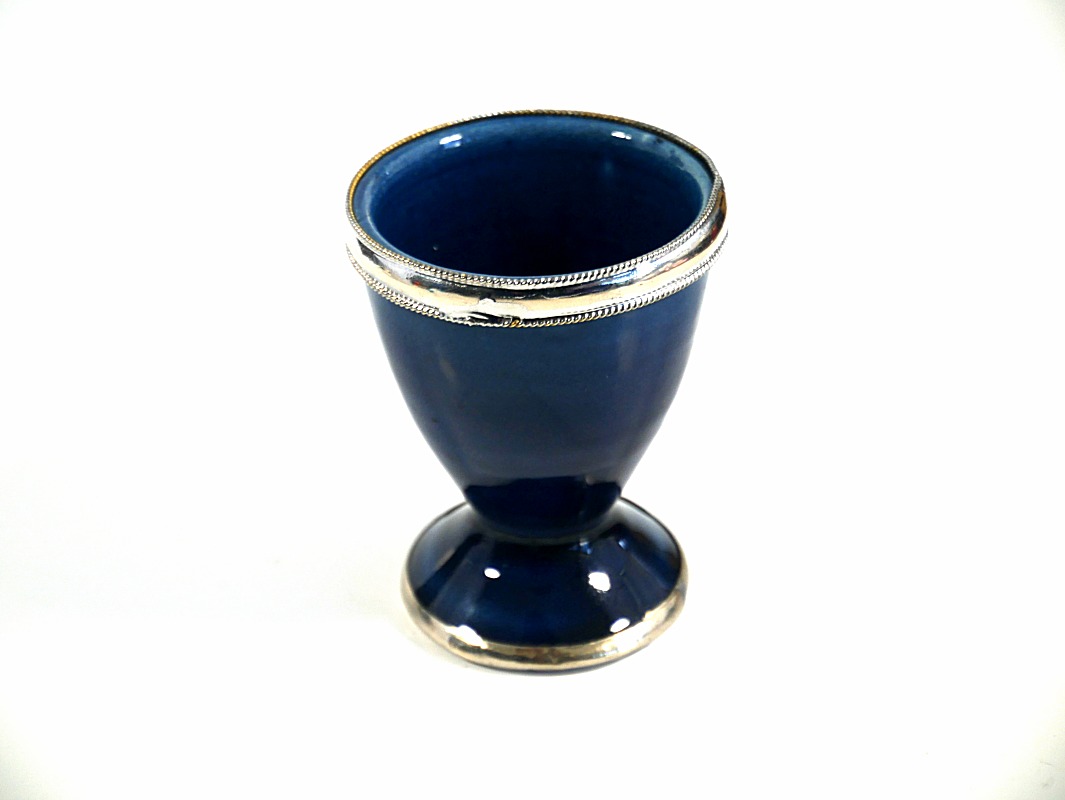 Coquetier artisanal en poterie, en provenance de Marrakech (Maroc), peint en bleu pétrole, émaillé, et cerclé de métal ornemental argenté, légèrement ciselé.