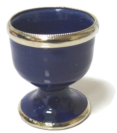 Coquetier artisanal en poterie, en provenance de Marrakech (Maroc), peint en bleu, émaillé, et cerclé de métal ornemental argenté, légèrement ciselé.