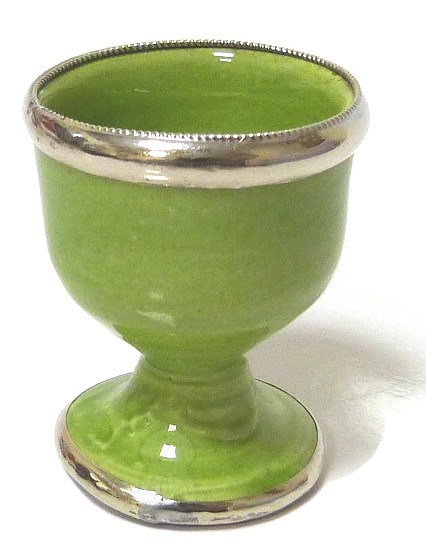 Coquetier artisanal en poterie, en provenance de Marrakech (Maroc), peint en verre, émaillé, et cerclé de métal ornemental argenté, légèrement ciselé.