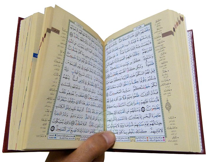 A ce propos, beaucoup de grands ulémas comme (Algazali, Alnawawi, Assiouti ...) ont cru qu'il serait utile et préférable de mettre les letters qui subissent à des règles de récitation en différentes couleurs pour faciliter la psalmodie du Coran. De même, ils n´ont pas trouvé de contre-indications religieuses qui empêchent la codification colorée.