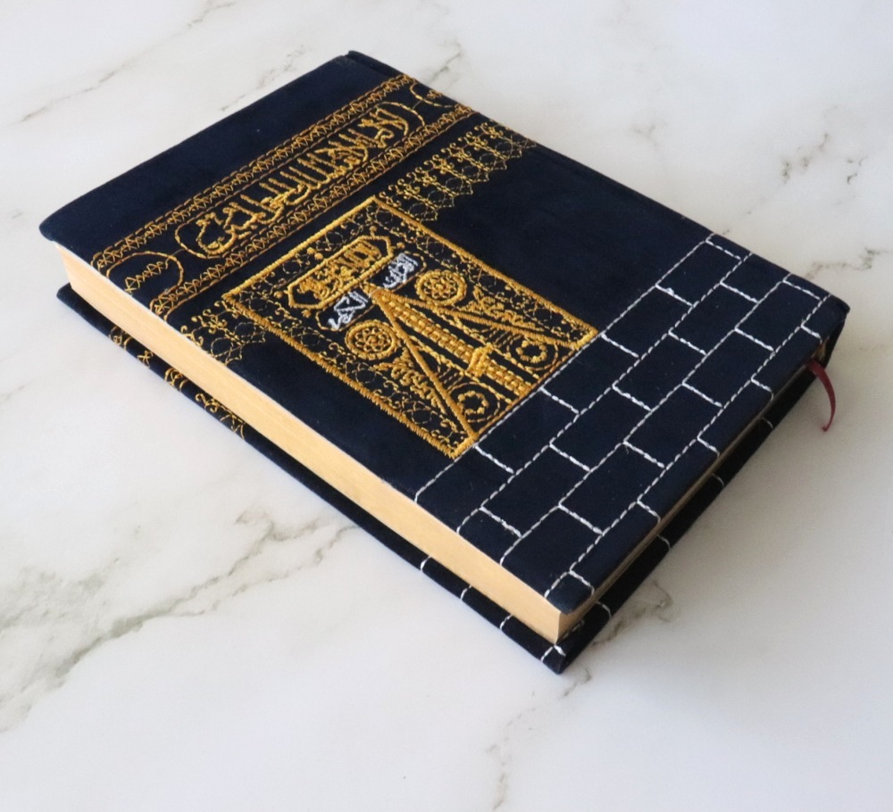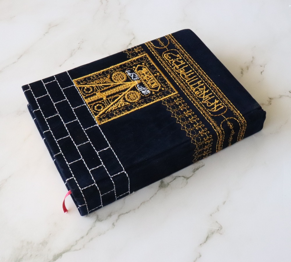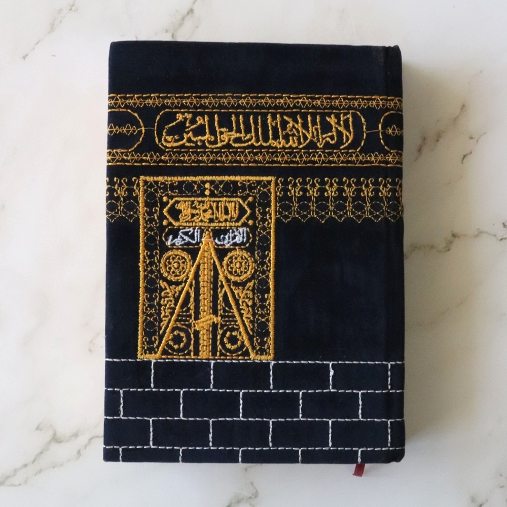 Le Saint Coran recouvert de velours brodé avec la forme de la Kaaba. Marque page intégré. Impression en plusieurs couleurs. Les pages sur le côté sont dorées.