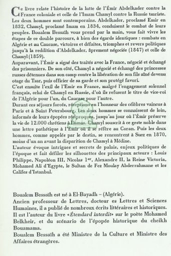 Boulalem Bessaïh nous raconte une histoire étrange mais fort intéressante et fort belle, car elle nous instruit et nous fait réfléchir sur l’oeuvre du hasard. Ah ! comme le hasard construit bien, en effet, le destin des hommes, et particulièrement celui de ces deux génies patriotes: Abdelkader, l’Algérien et Chamyl, le Caucasien! Pour comprendre les tenants et les aboutissants de cette «structure» stochastique, il faut lire l’ouvrage De l’Emir Abdelkader à l’Imam Chamyl que nous propose Boualem Bessaïh.