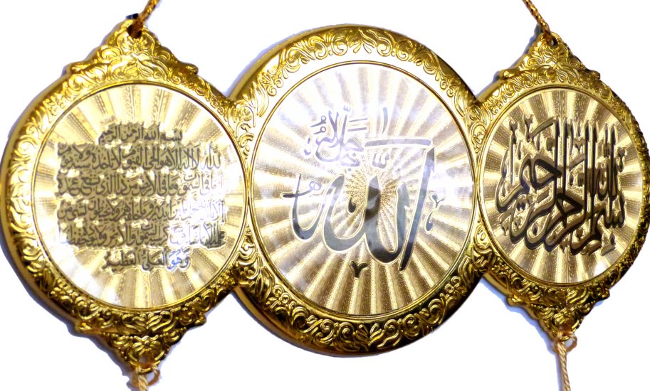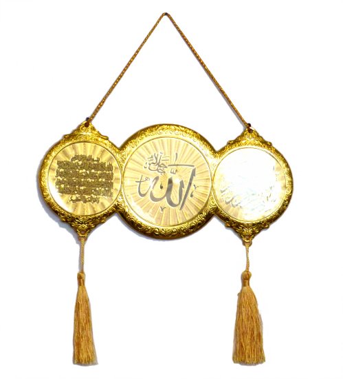 Très belle décoration murale originale entièrement dorée, constituée de trois parties rondes contenant des calligraphies artistiques du Nom d'Allah, de Bismillah ar-rahman arrahim et de Ayatoul-Koursi (Verset du Trône). Deux pompons sont suspendus de part et d'autre de l'objet pour une finition soignée.