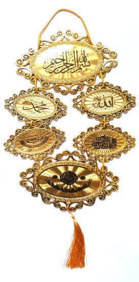 Decoration islamique doree contenant la Basmalah, Allah, Muhammed (PBDSL), Sourates Yasin, etc.