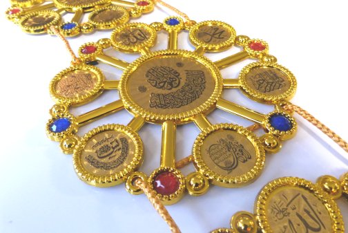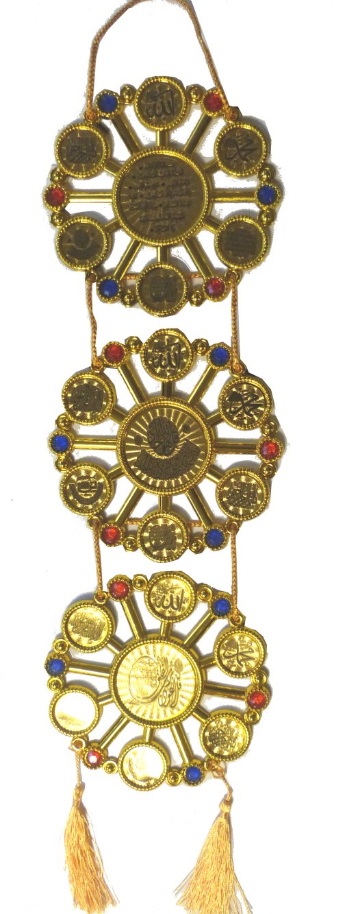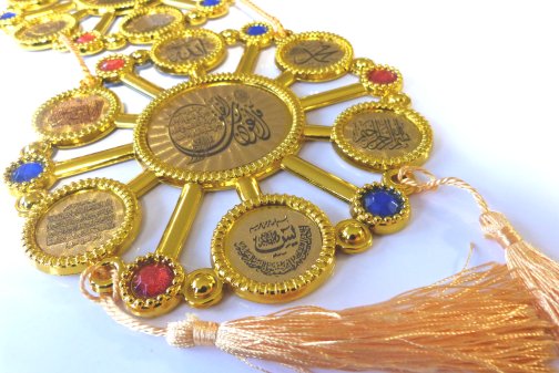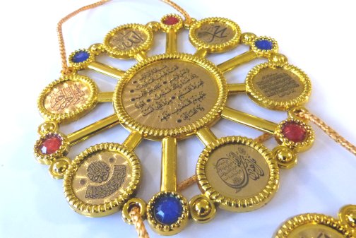 Pendentif doré mural avec les inscriptions calligraphiques des sourates coraniques "AL-FATIHA" sur la partie du haut, "AL-FALAQ" sur la partie du milieu et "AL-IKHLASSE" du milieu de bas. Ainsi que de nombreuses autres inscriptions et des diamants rouges et bleus tout autour...