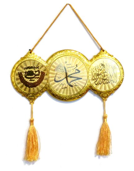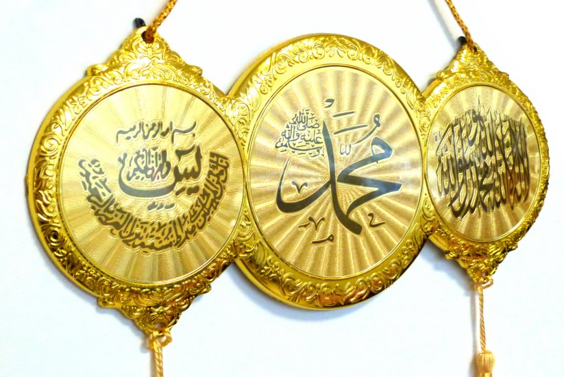 Decoration murale doree avec trois parties contenant l'Attestation de foi, Le Nom de prophete Muhammad (SAW) et Sourate Yassin