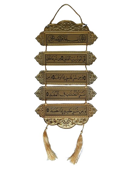Pendentif doré avec pompons au bout, contenant la Sourate Al-Falaq (Sûratu-l-Falaq) à connaître par cœur et à réciter quotidiennement pour se protéger de tout mal.