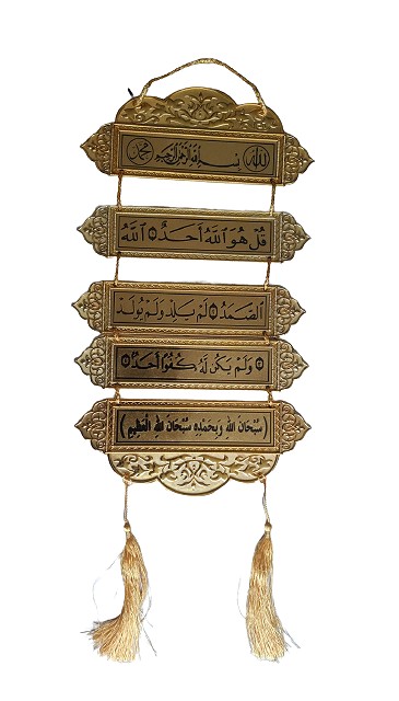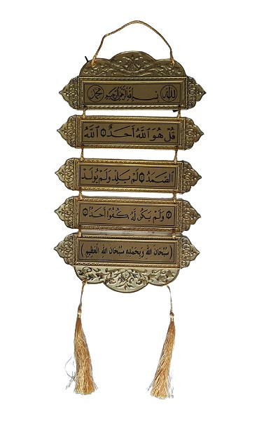 Pendentif doré avec pompons au bout, contenant la Sourate Al-Ikhlas complète et Tasbih à connaître par cœur et à réciter quotidiennement pour se protéger de tout mal. Objet décoratif musulman idéal à suspendre dans n'importe quelle pièce de la maison (salon, chambre, couloir...).