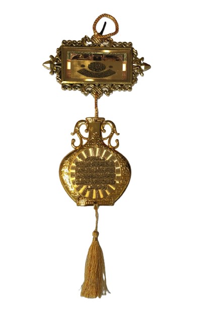 Pendentif islamique décoratif doré le verset du Trône (Ayatu l-Kursî) et le nom du prophète Muhammad et l'attestation de foi (chahada) - REF. 23883 (4.50 €)