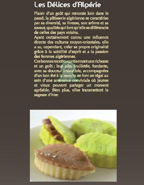 Plaisir d’un goût qui remonte loin dans le passé, la pâtisserie algérienne se caractérise par sa diversité, sa finesse, son arôme et sa saveur, qualités qui font qu’elle se différencie de celles des pays voisins. Ayant certainement connu une influence directe des cultures moyen-orientales, elle a su, cependant, créer sa propre originalité grâce à la subtilité d’esprit et a la passion des femmes algériennes. Ces bonnes recettes contiennent une richesse et un goût ; leur pâte feuilletée, fondante, avec sa douceur irrésistible, accompagnées d’un bon thé à la menthe en font un régal au sein d’une ambiance conviviale où jeunes et vieux peuvent partager un moment agréable. Bien plus, elles transmettent la sagesse d’hier.